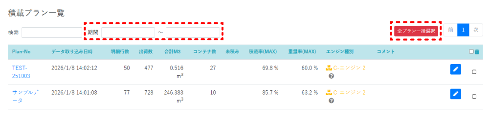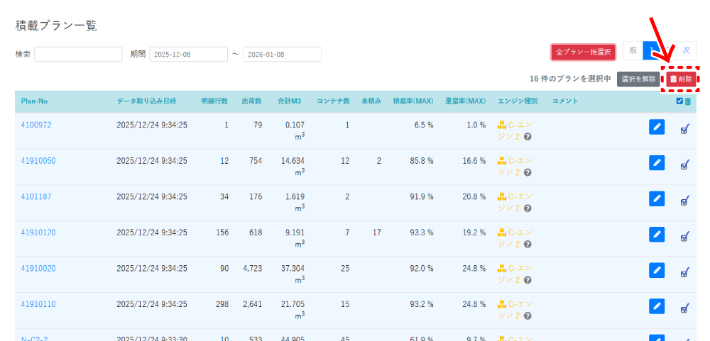 特定の期間に作成されたプランを削除したい場合は、以下の手順で操作してください。