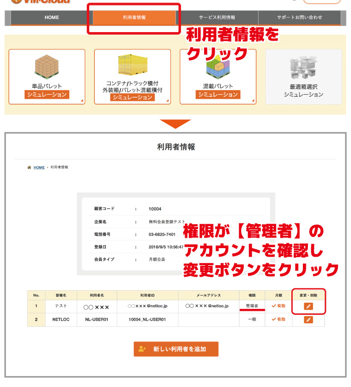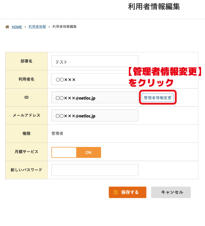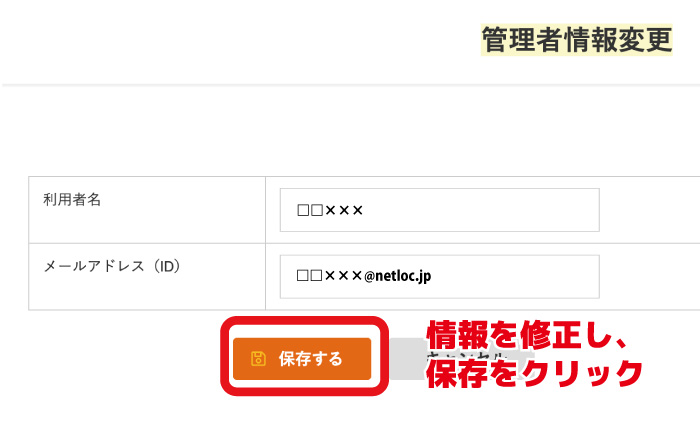 【利用者管理画面】にて管理者アカウントの情報を変更することが可能です。