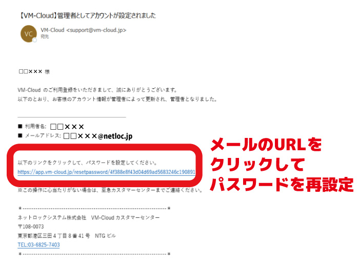 メール本文内のURLをクリックし、新しいパスワードを設定してください。